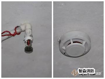 (實驗畫面顯示,火災發生后,獨立感煙探測器開始報警,簡易噴淋開始噴水)